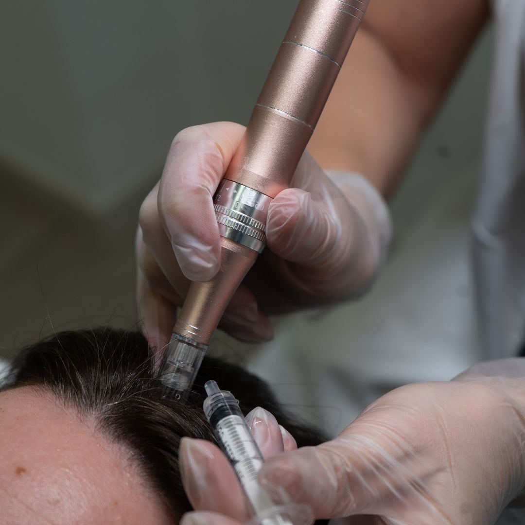This treatment uses a fine-needle device (we use Dr.Pen) to create tiny, controlled micro-injuries in the scalp. These points stimulate local blood flow, signal repair processes, and help deliver active ingredients deeper into the skin. Before the microneedling process, we apply Dermaheal HL, a professional serum rich in biomimetic peptides, vitamins, amino acids, and growth factors. As the microneedling begins, the serum is gently pushed into the scalp, increasing its effectiveness.